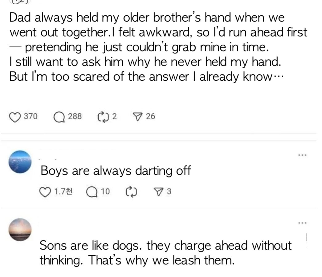 In Korean, a complete daughter-obsessed dad is called 딸바보 (ttal-babo), meaning ‘daughter-stupid’. but no 아들바보, son-stupid